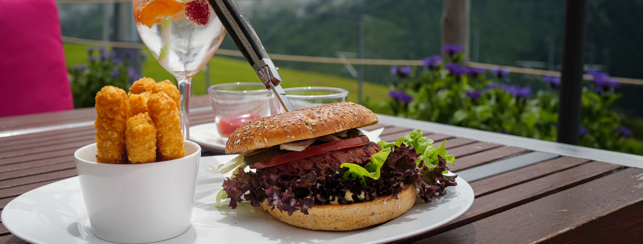 Familienrestaurant Matti – Veganer Matti-Burger mit herzhafter Haussauce und Süssmais frites
