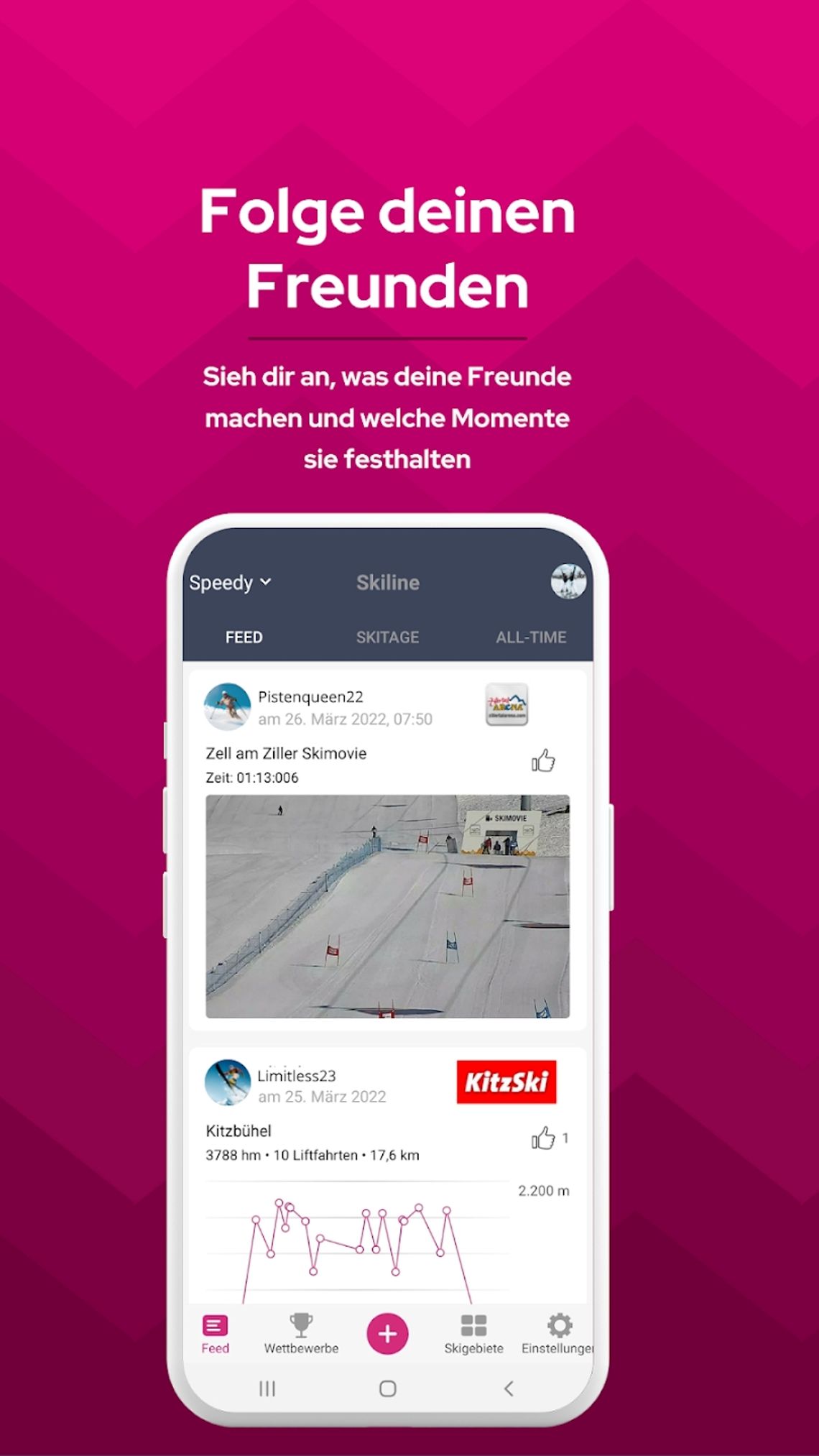 Puoi visualizzare le tue foto, i metri di dislivello e i chilometri di pista anche nella nostra app Mountain Access collegando il tuo account Skiline sotto 'My Moments'.