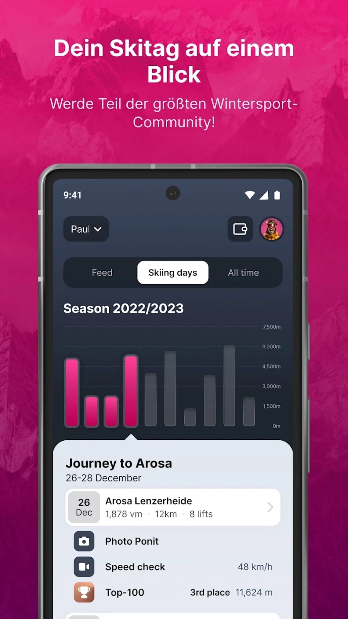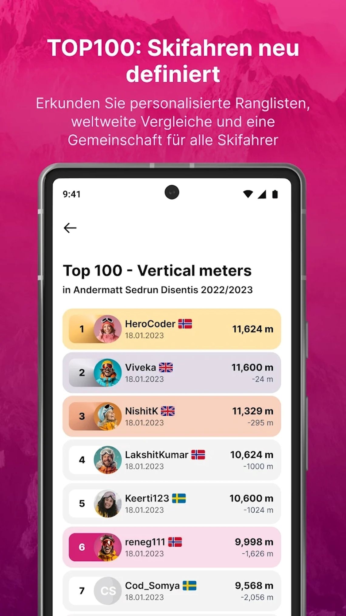 Sfida altri sciatori nella Top 100 e scopri chi ha accumulato più metri di dislivello in una stagione o in un giorno!